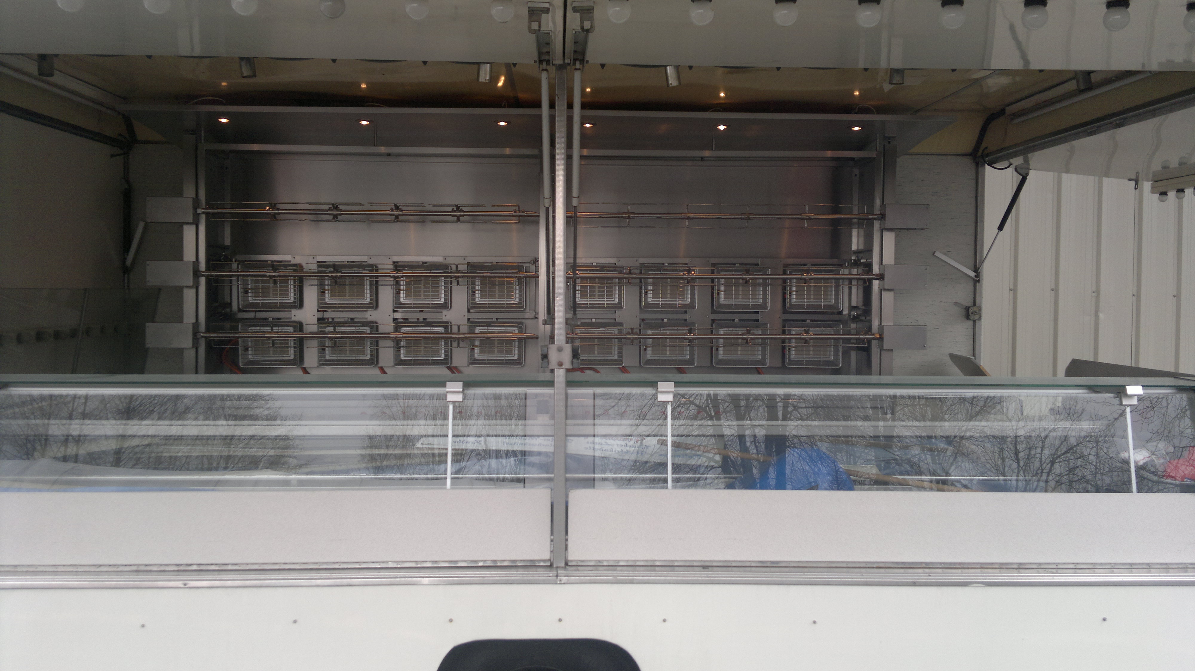 Der Grill ist in einen hochwertigen weiss lackierten Anhänger mit Aluminium-Außenhaut (ohne Beschriftung, Werbeschild auf Dach klappbar) montiert. Der Anhänger fügt sich harmonisch in jeden Pagoden- oder Veranstaltungsaufbau ein. Deichsel und Radkasten können weiss verkleidet werden.
