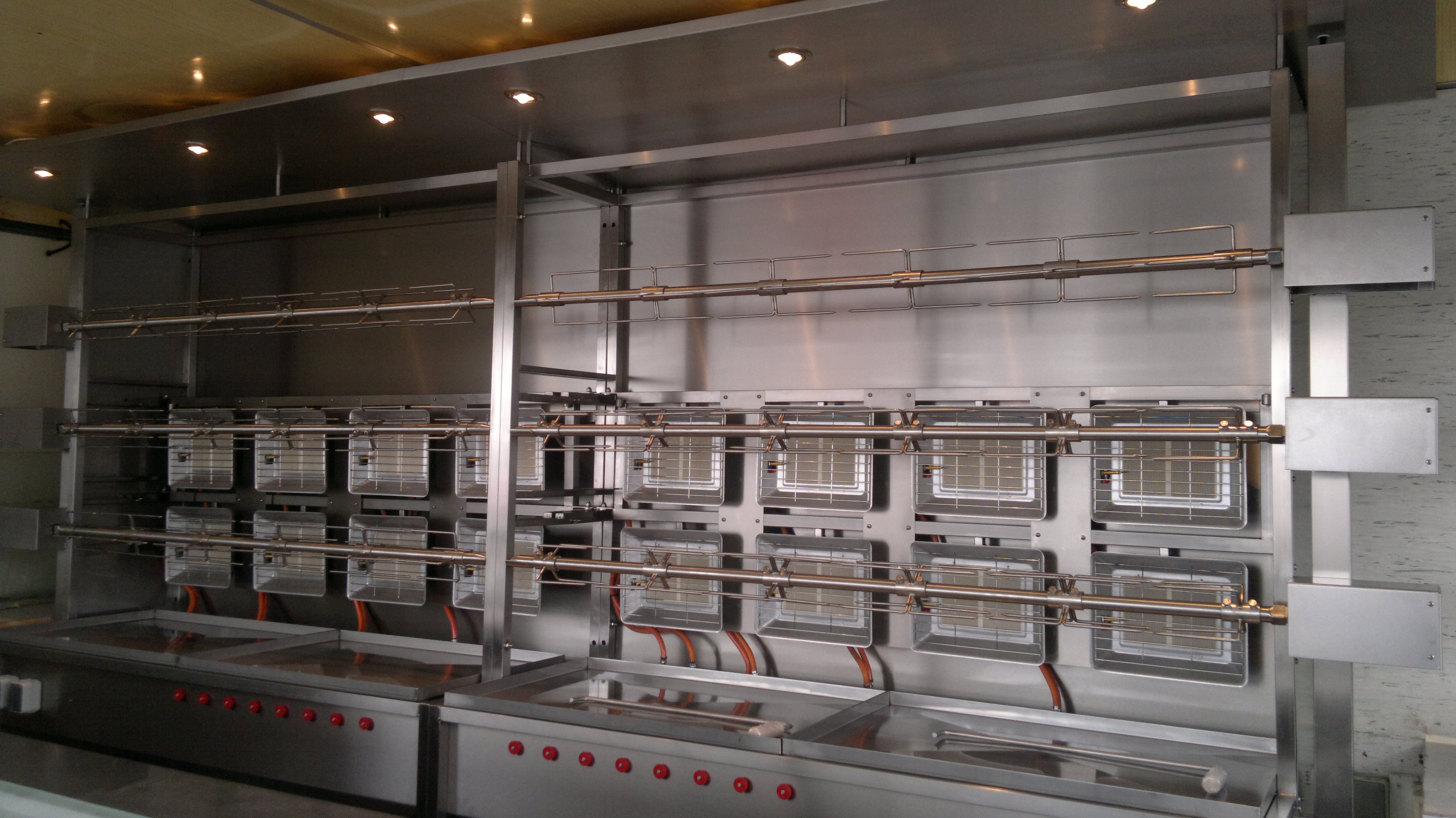 Sechs Edelstahlspieße mit einer Gesamtlänge vom fast 10 Metern und 16 High-Tec Keramik-GasBrenner ermöglichen es uns 40-50 Grillschinken, 4-6 Spanferkel oder 2-3 Ochsenkeulen gleichzeitig zu grillen. Der Besucher Ihres Events oder Ihr Cateringgast steht vor einer 4,50 Meter breiten sich drehenden Grillkonstruktion/Fleischwand und er bekommt sofort Appetit auf mehr.